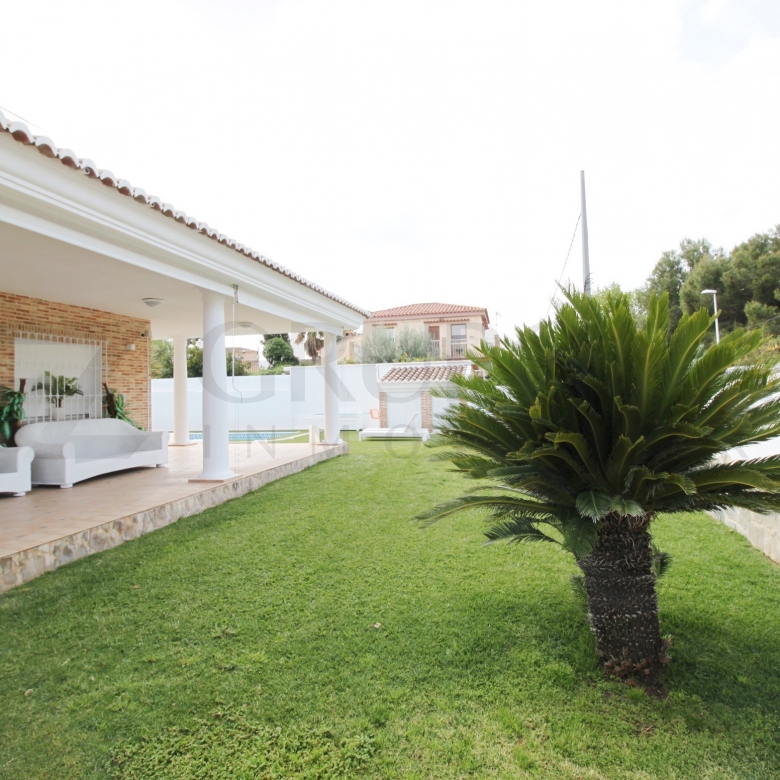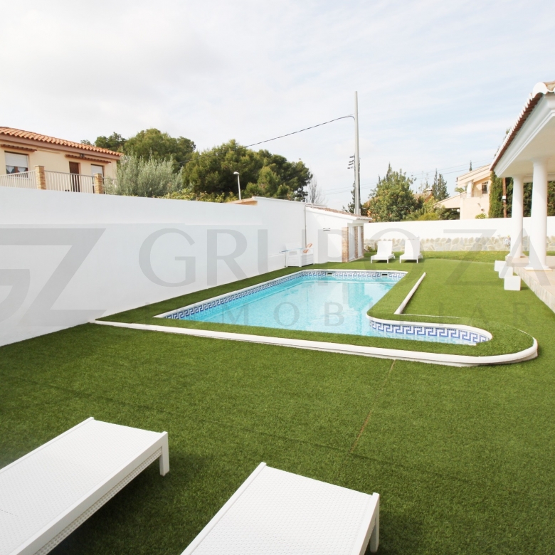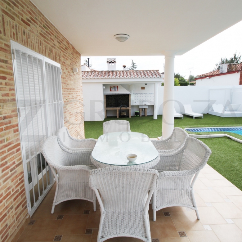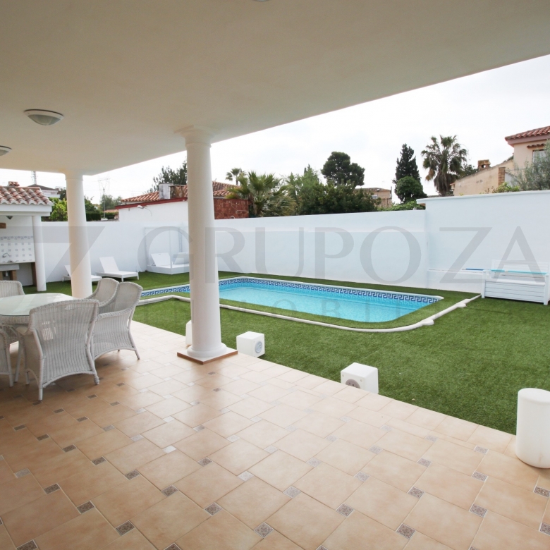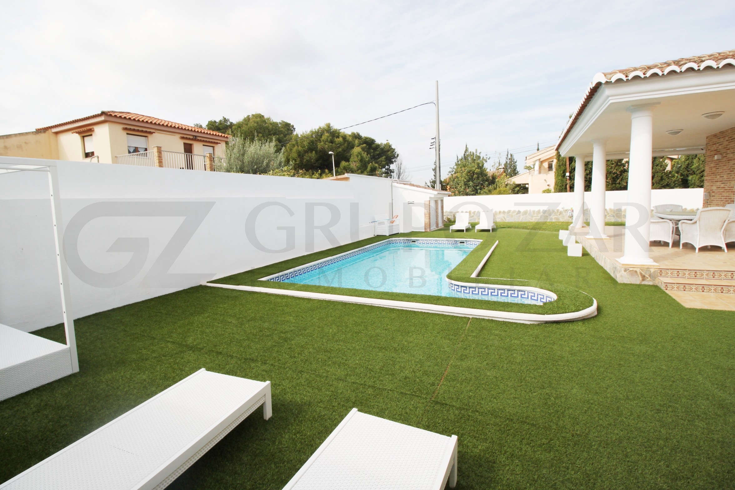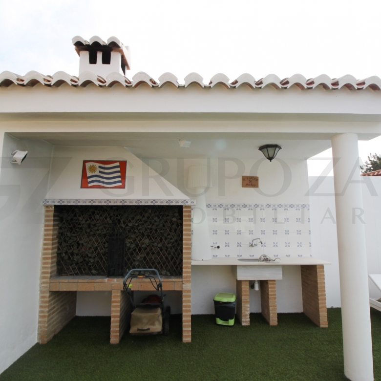 La parcela esta muy buen cuidada, tienes tu zona delantera con césped natural, la zona de terraza cubierta delante y en el lateral que da a la zona de la piscina con todo su alrededor con césped artificial, su zona chill-out y su paellero, con un trastero.