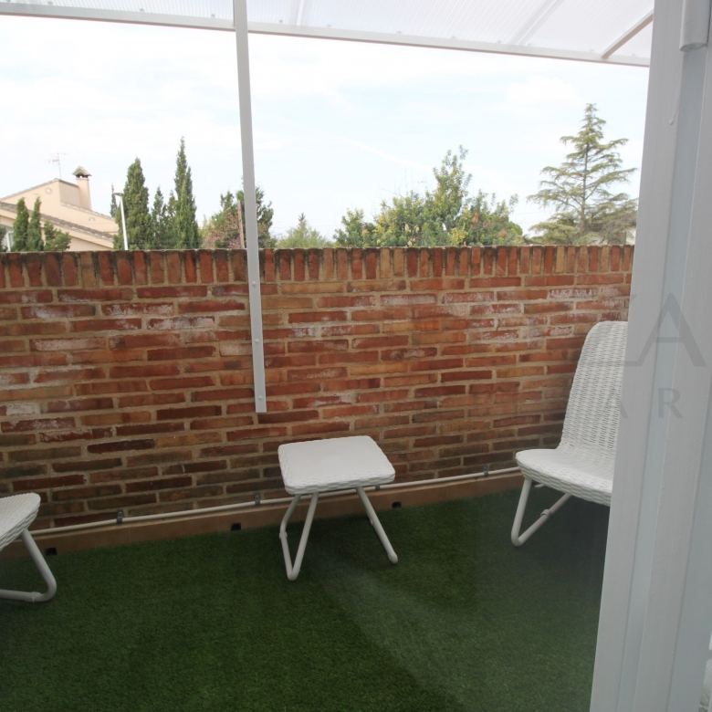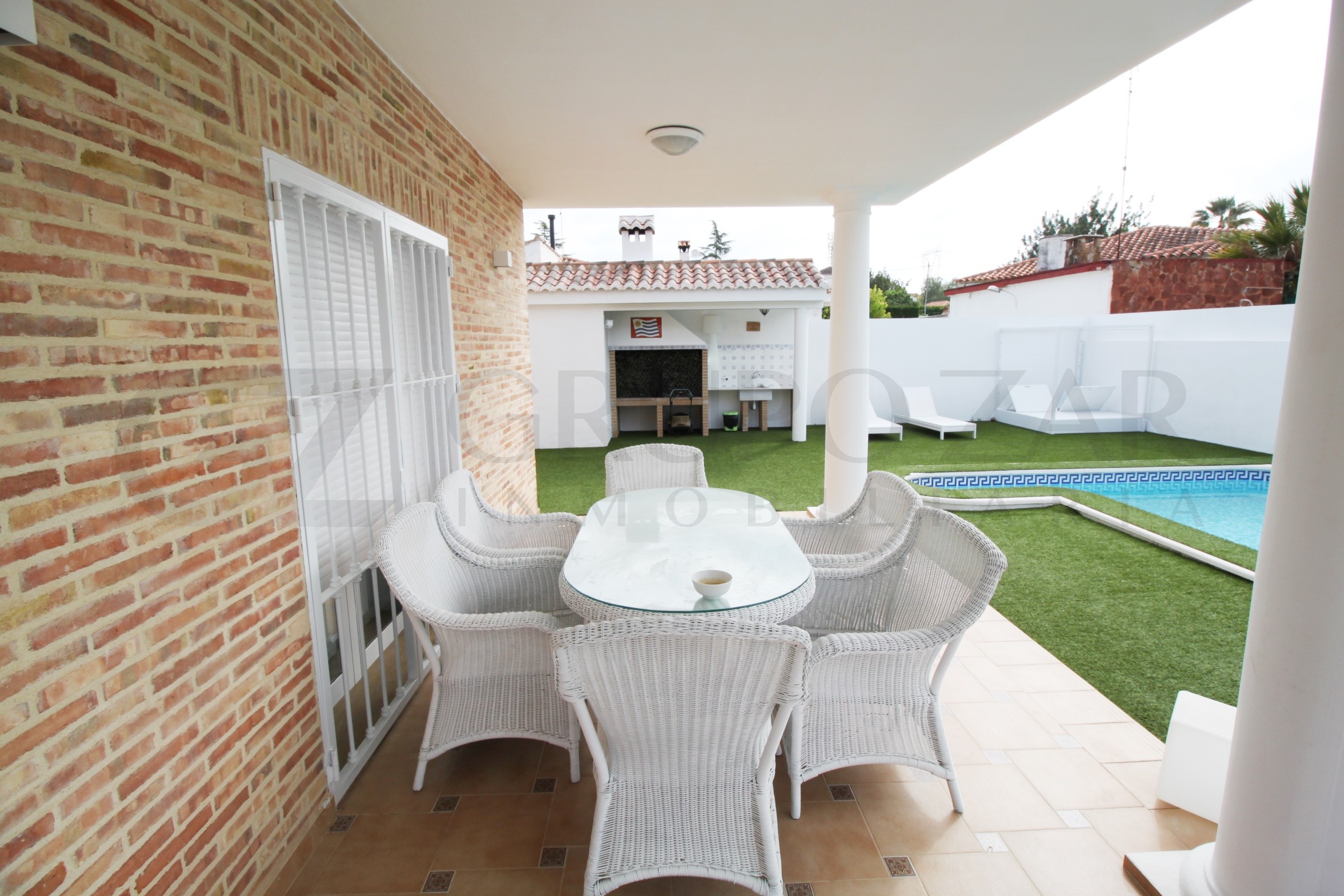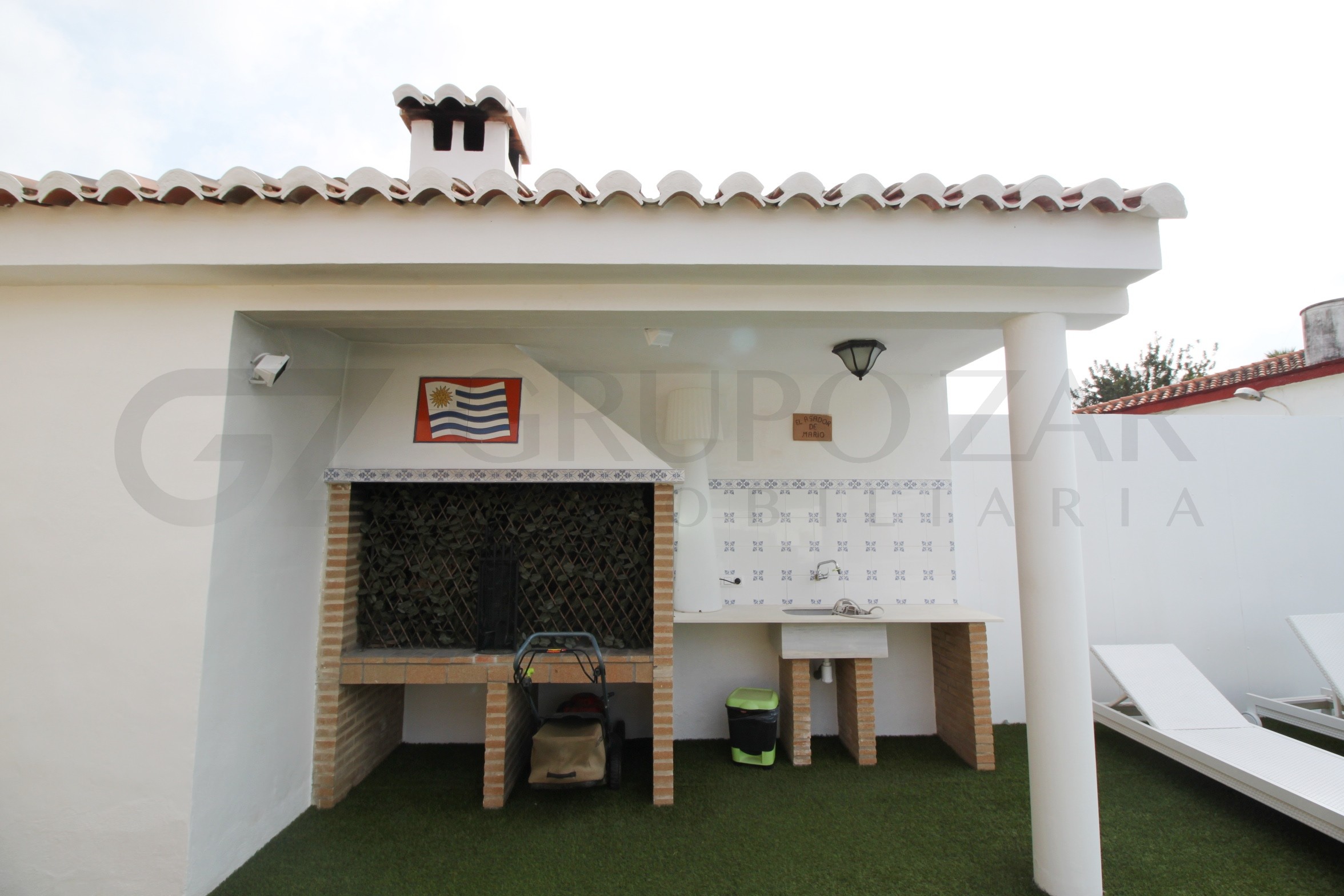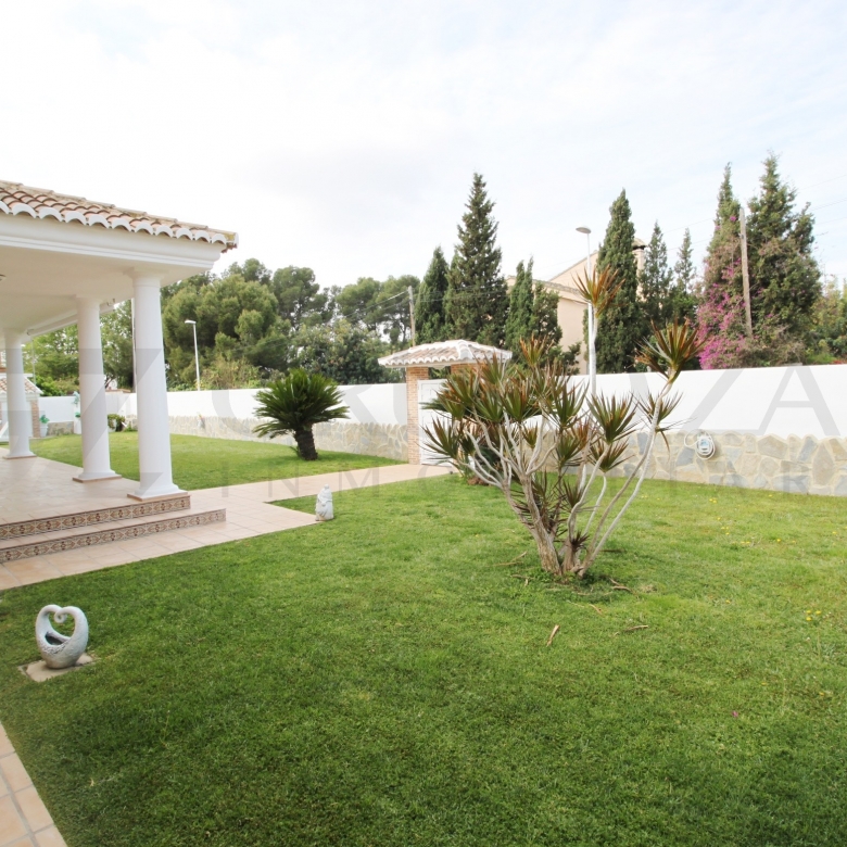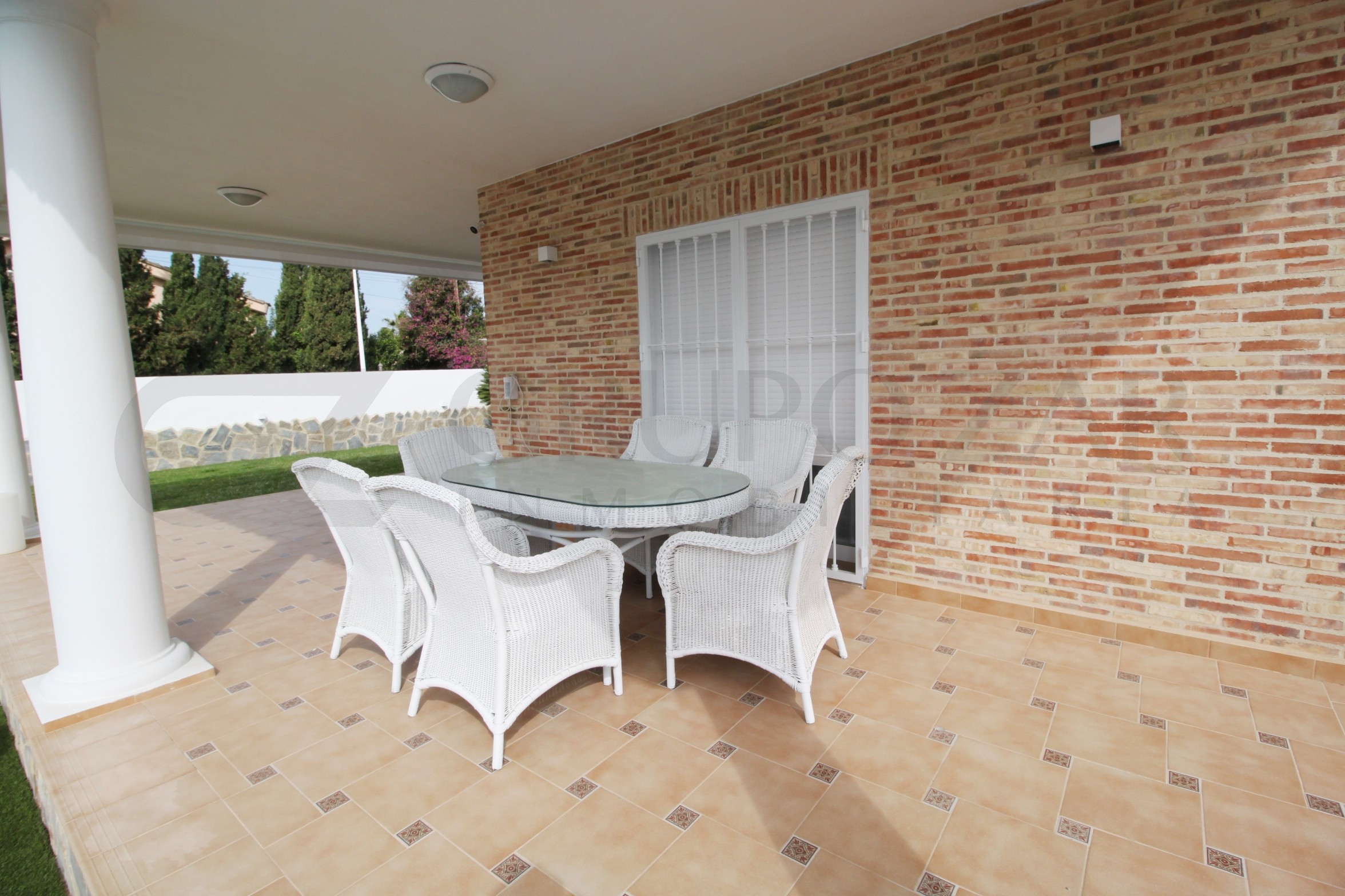 La parcela esta muy buen cuidada, tienes tu zona delantera con césped natural, la zona de terraza cubierta delante y en el lateral que da a la zona de la piscina con todo su alrededor con césped artificial, su zona chill-out y su paellero, con un trastero.
