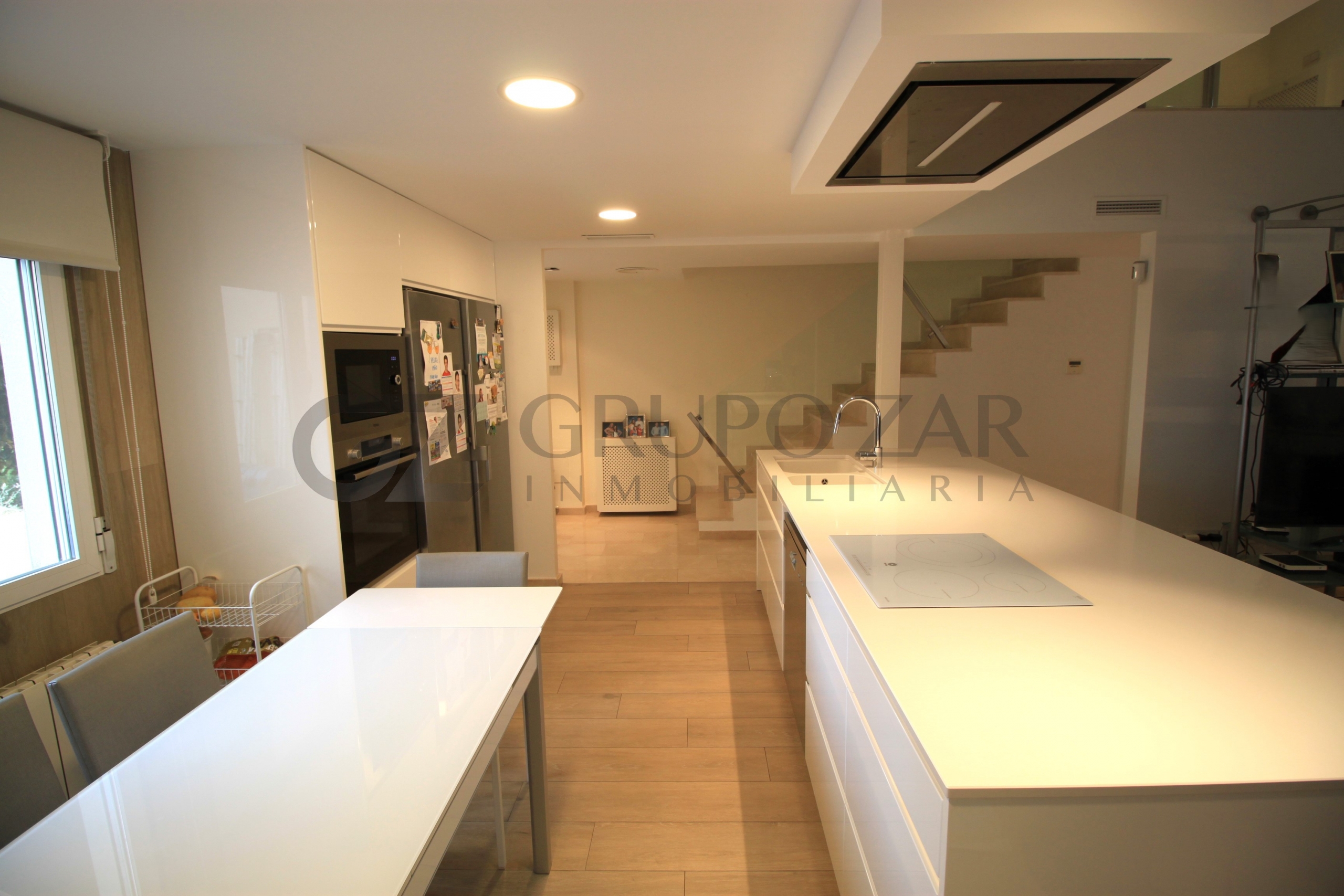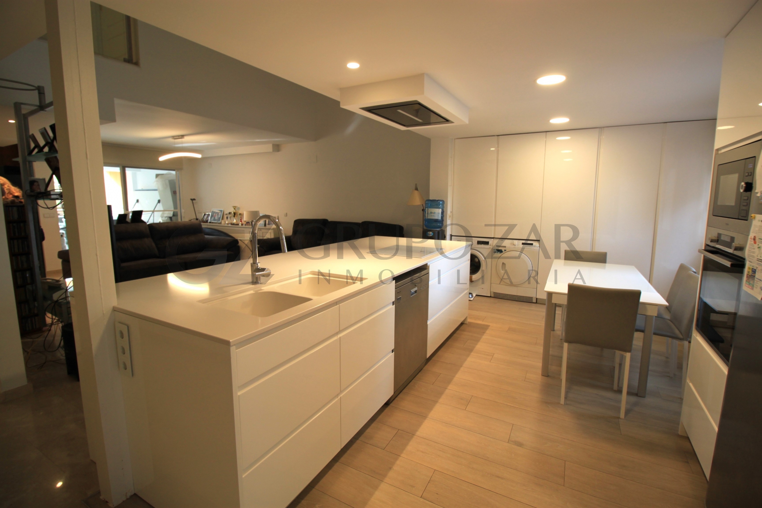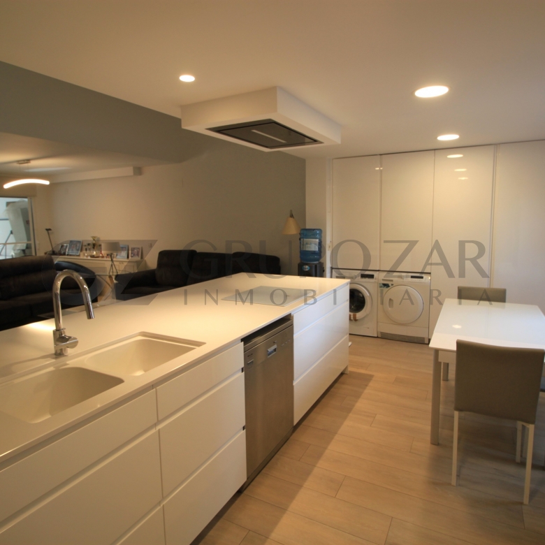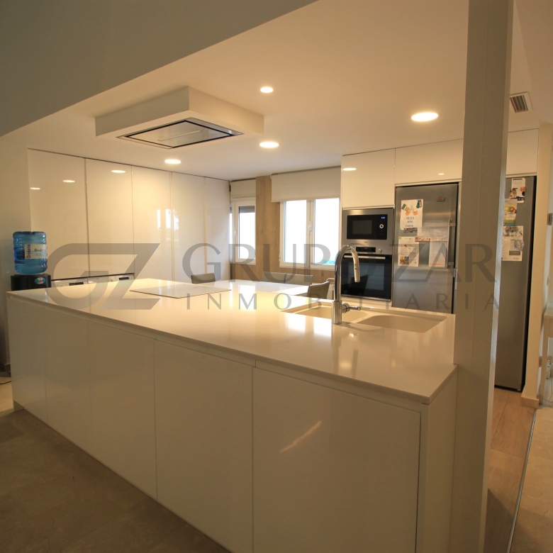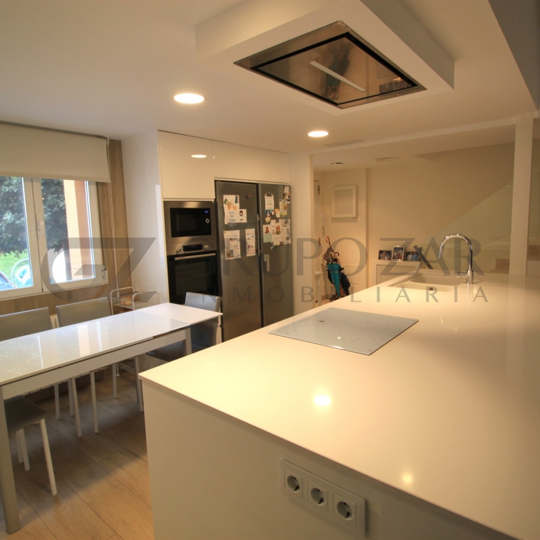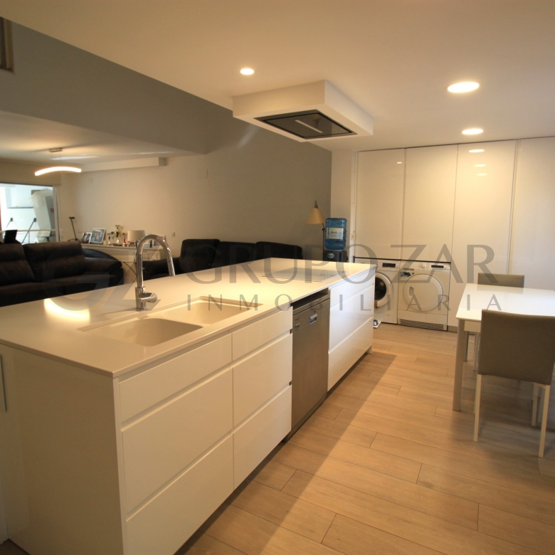 En la planta baja encontramos un gran salón comedor con cocina americana con una preciosa isla, todo abierto para conectar ambas partes de la vivienda y crear un espacio familiar.