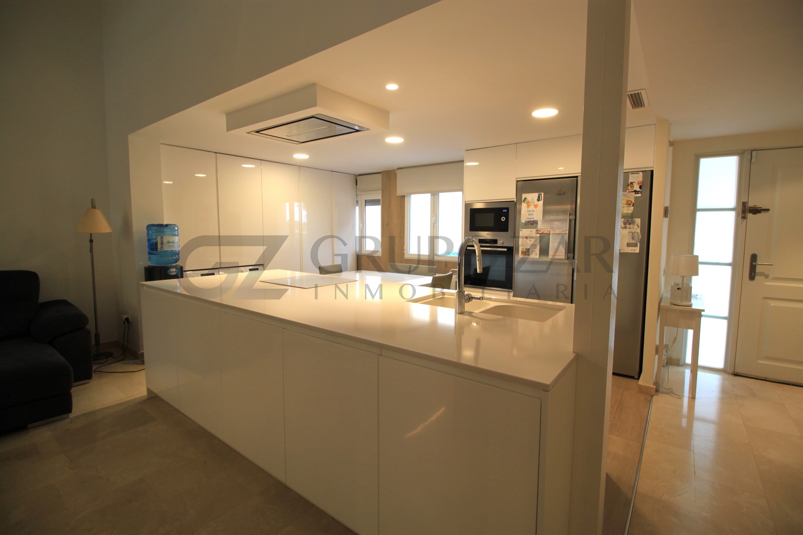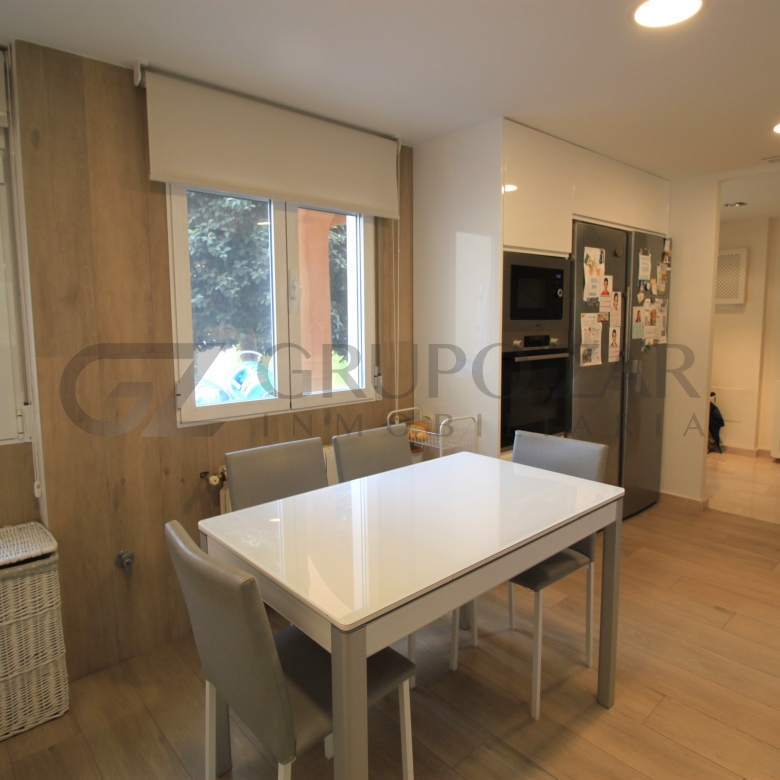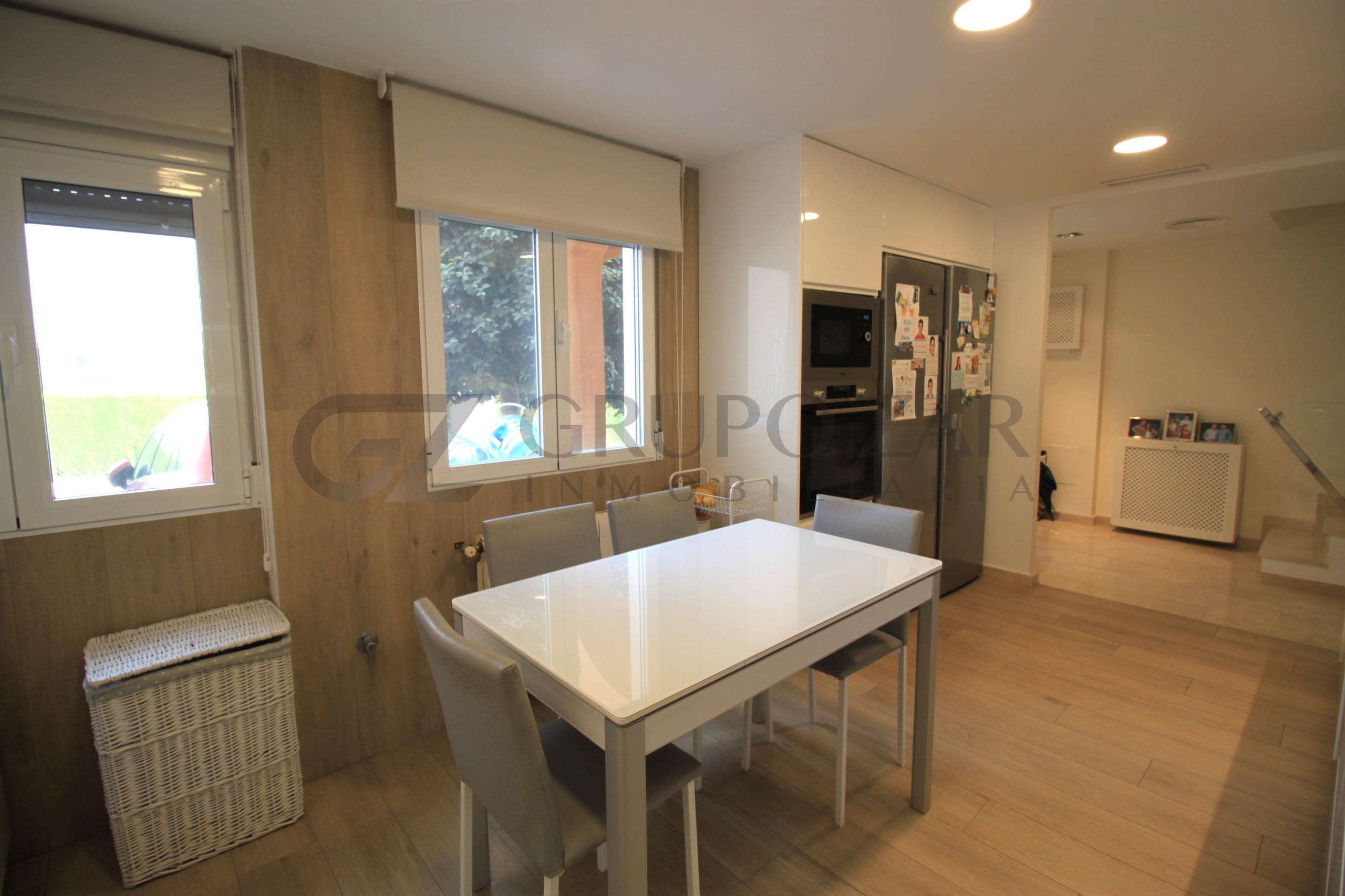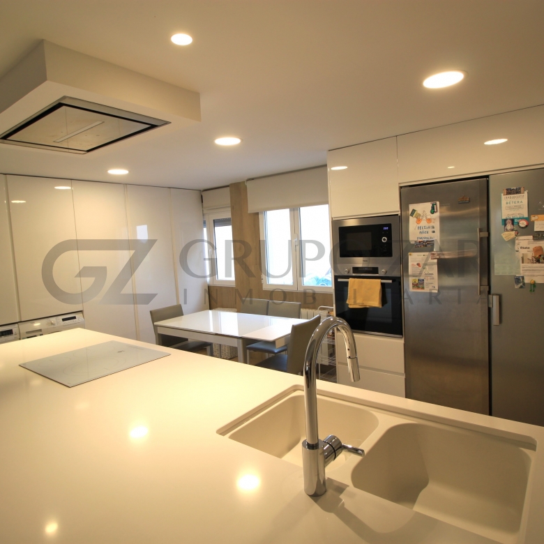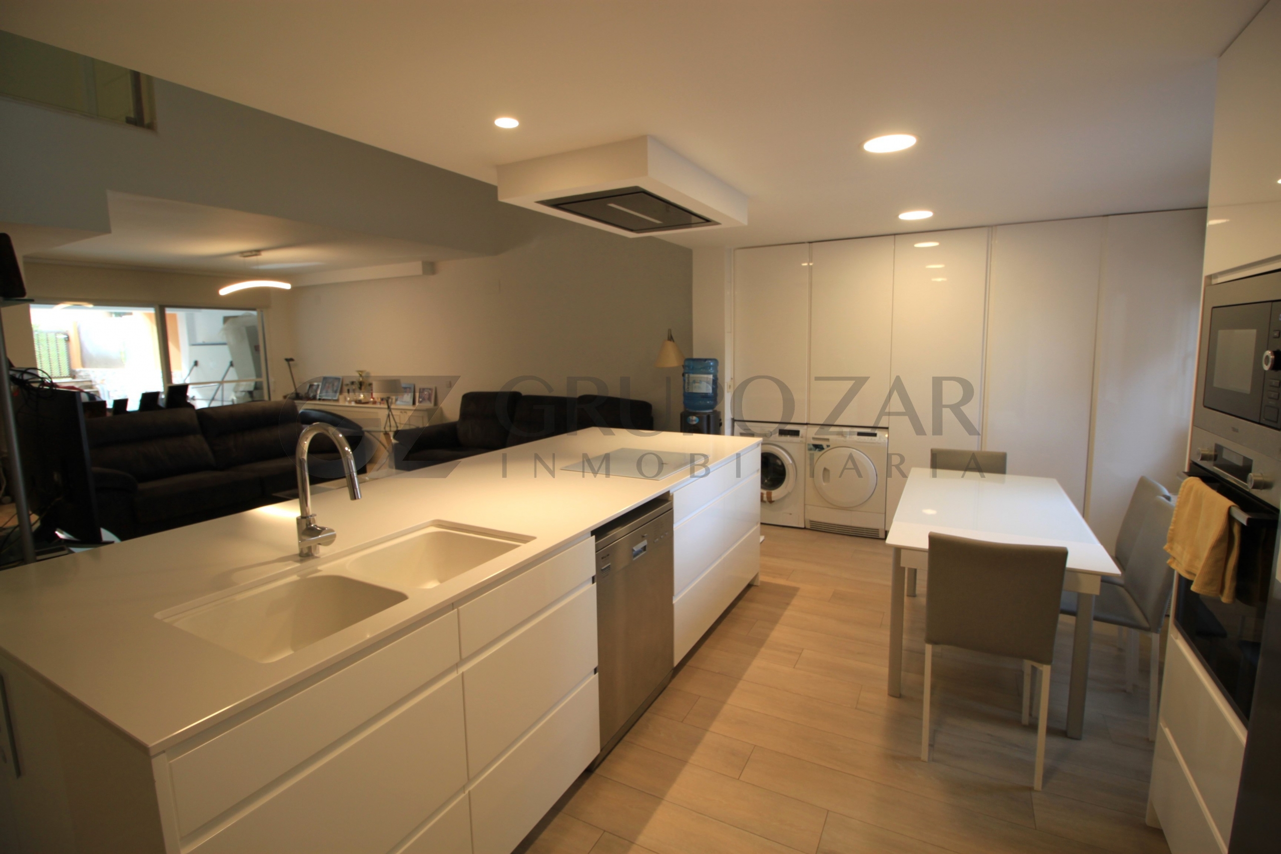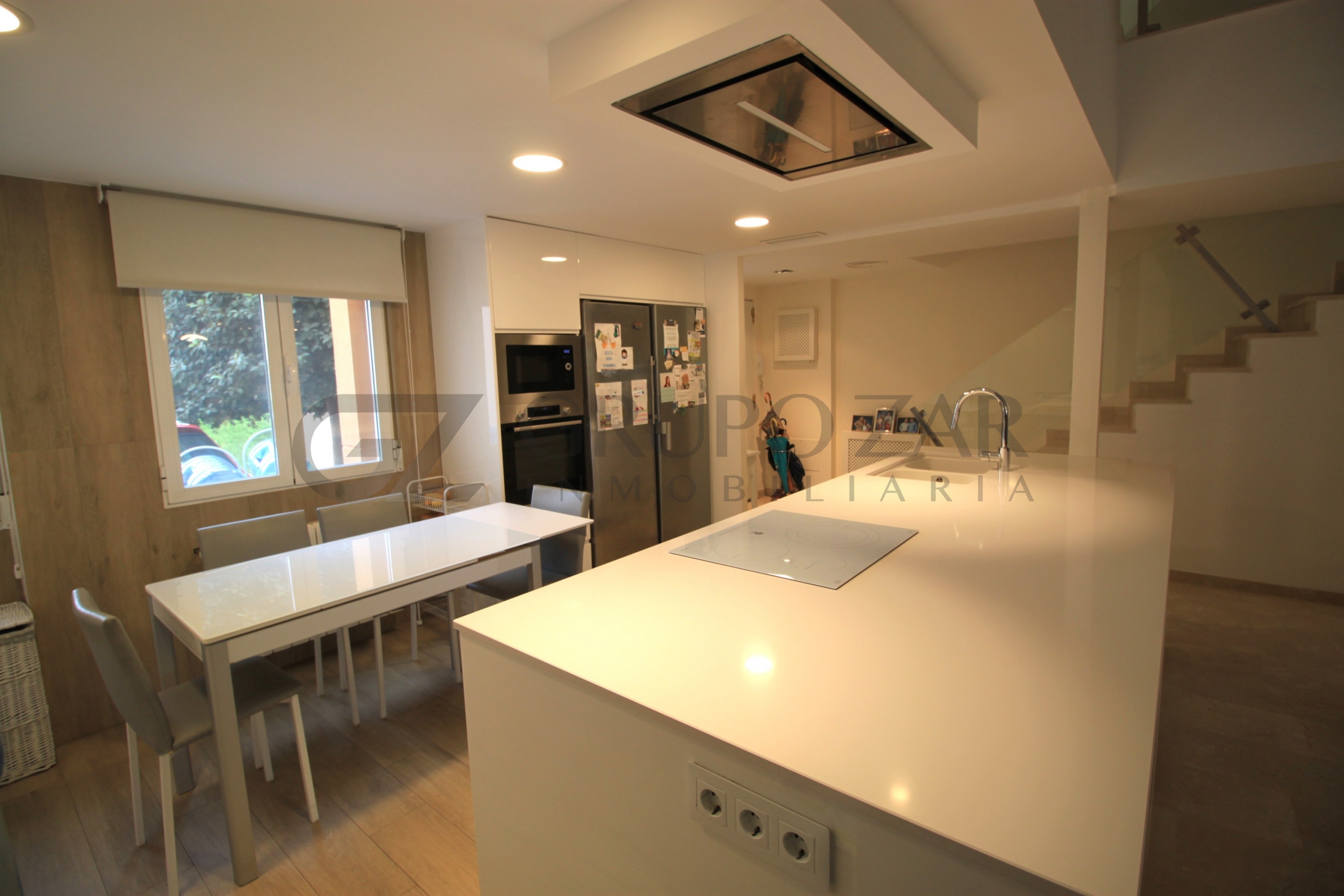 En la planta baja encontramos un gran salón comedor con cocina americana con una preciosa isla, todo abierto para conectar ambas partes de la vivienda y crear un espacio familiar.