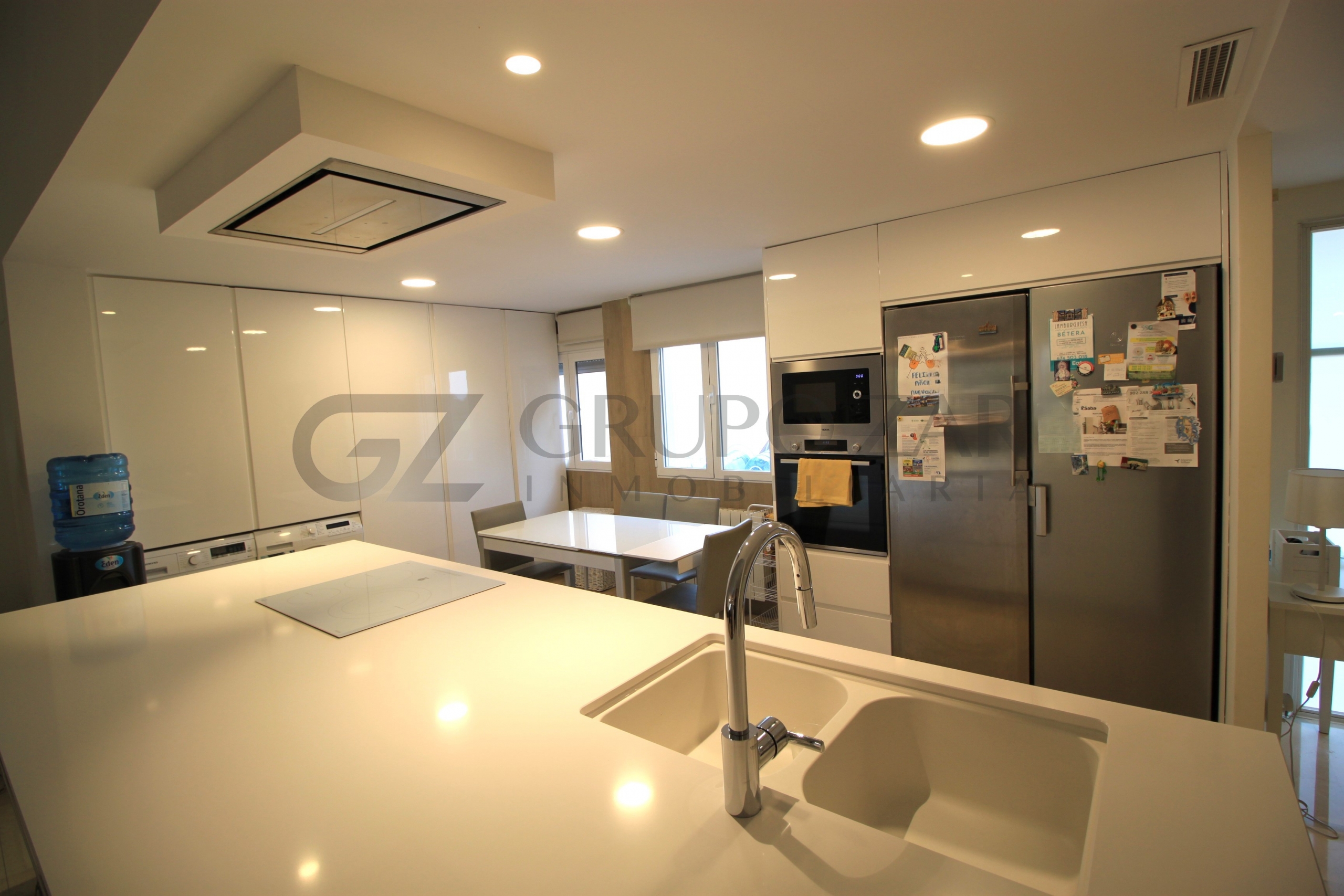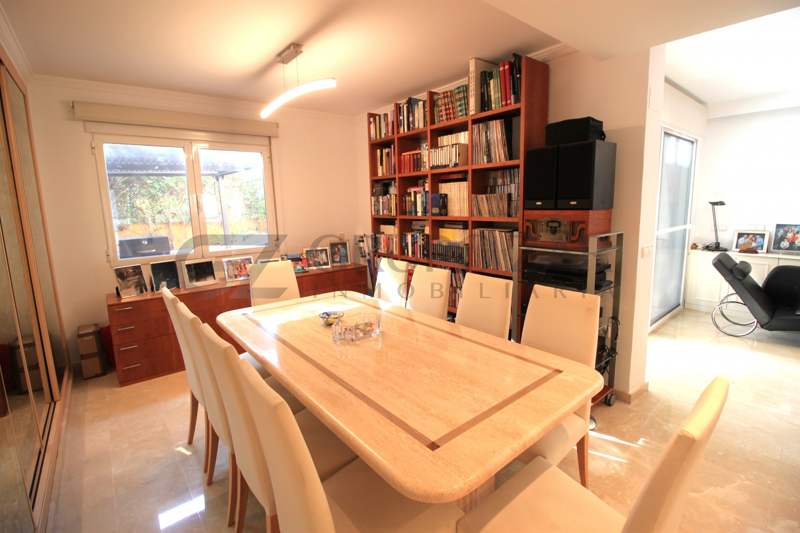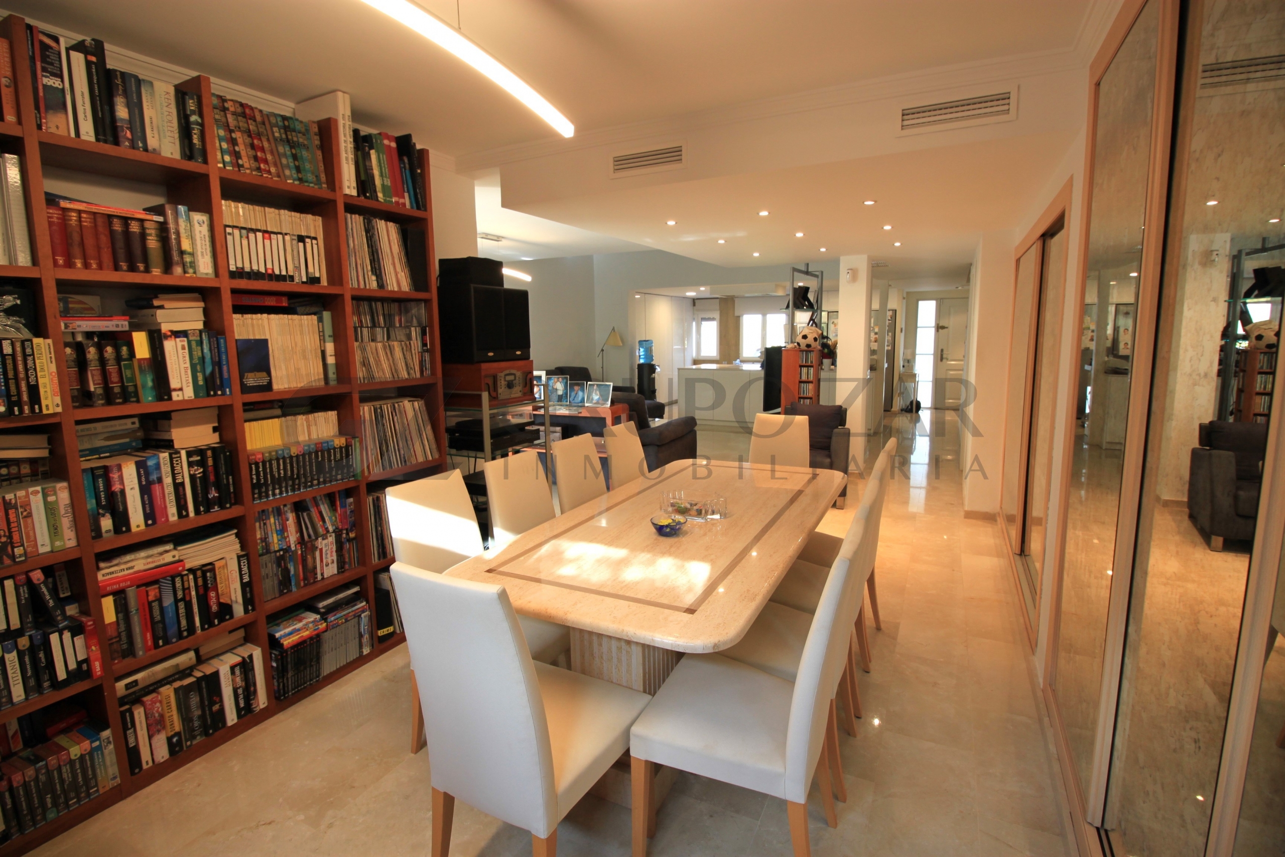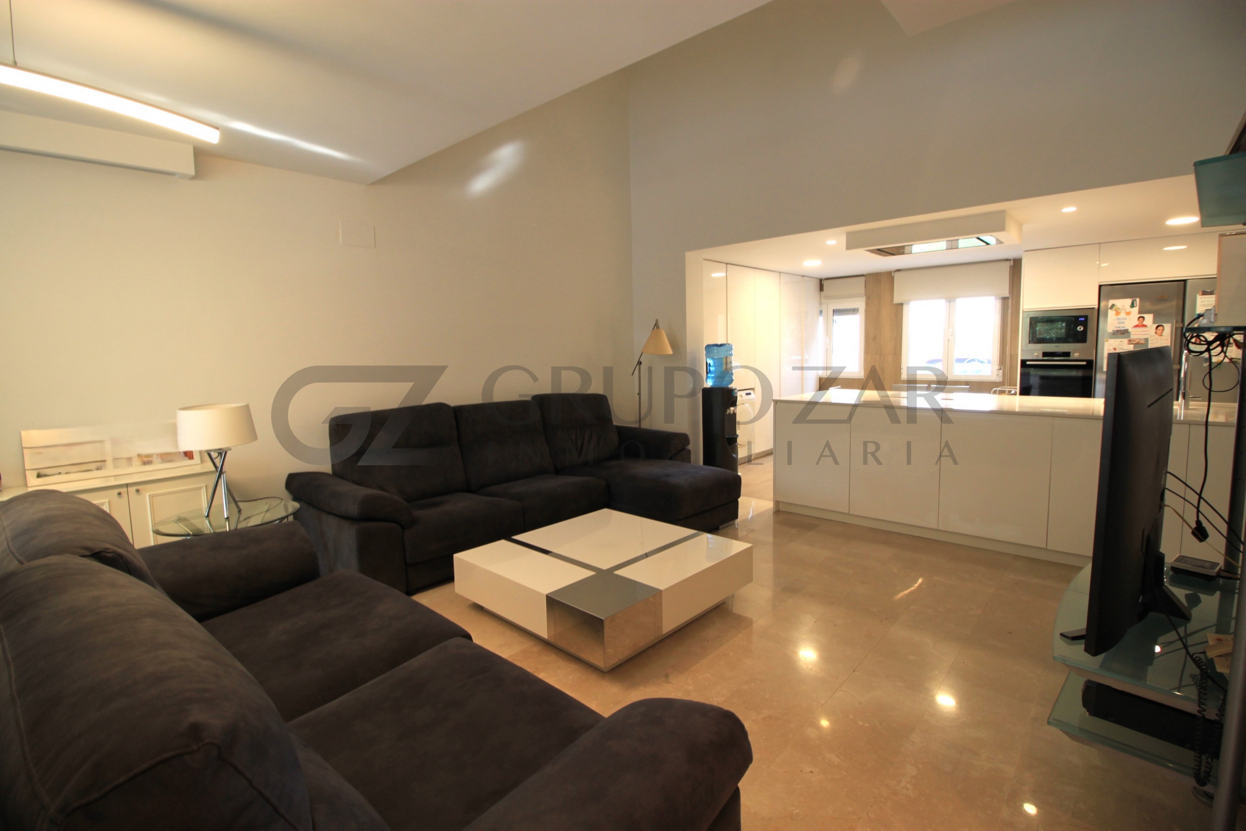 En la planta baja encontramos un gran salón comedor con cocina americana con una preciosa isla, todo abierto para conectar ambas partes de la vivienda y crear un espacio familiar.